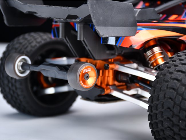 (1) The wheel cover is Machined from tough 7075-T6 aluminum and hard-anodized in brilliant eye-catching colors, these wheelie bar wheels are the perfect finishing touch for your ride.