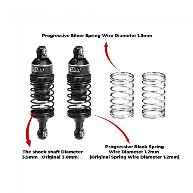 (2) The black progressive spring installed on the shock absorber(wire diameter of 1.2mm). GPM will also include an additional silver progressive spring(1.3mm wire diameter) in the package, which can be replaced according to your own needs